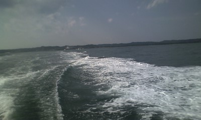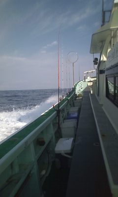 なんと今回は無風・ベタ凪(波がない)・いい天気~と来たモンで、出港と同時にトモに4人並んで座り、遠ざかる大原の町並みを眺めながらポイントに着くまで談笑。