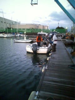やっさんとやっさんのお友達の人と3人で船に乗ってシーバスフィッシングですよ。